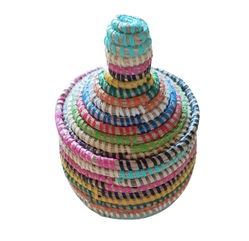Panier en osier avec couvercle fabriqué par les élèves du Centre de façon artisanale. 14cm de diamètre et 18cm de hauteur.